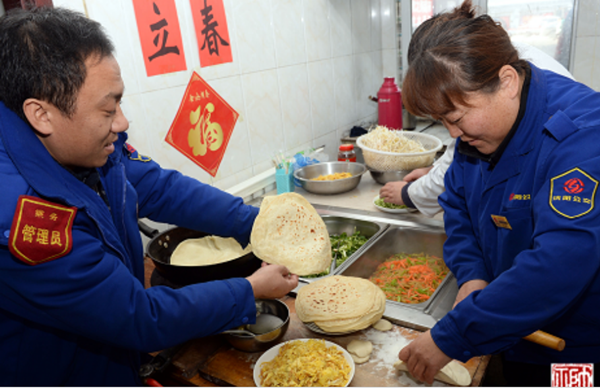 车队齐队长告诉记者,去年冬运开始后,沈阳各条公交线路终点站食堂为一线职工给予免费早午餐,保证驾驶员吃饱喝足再开工。“往常,早餐做花卷、鸡蛋、粥等早点,午餐是两素一荤,保证驾驶员营养充足。”齐队长说,初七当天是节后第一个工作日,2条线路60名驾驶员全部到岗。当天恰逢“立春”,立春是二十四节气之首,是民间最为重视的一个节气,这一天素有吃春饼、鞭春牛等习俗。车队条件简单,但为了让大家伙感受春的气息,让司机一起“咬春”,车队工作人员初六那天就采购好卷饼菜所需的食材,当天一大早就来到站房和面、烙饼。记者注意到,吃完春饼,齐队长还给每人发了一个“平安果”,寓意新的一年平平安安。