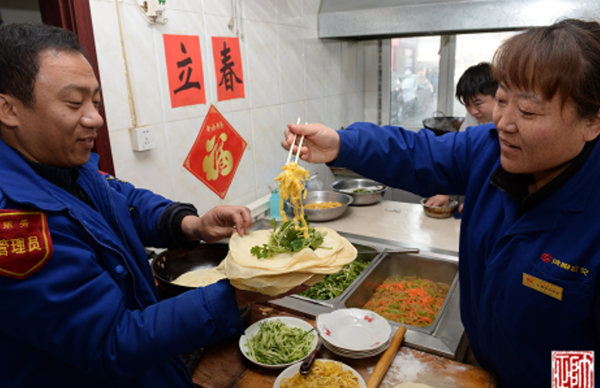 “哎呦,今天烙春饼啦!难怪老远儿就闻见了香味儿。快,给我先来两张!”2月3日大年初七,是节后的第一个工作日,恰逢立春。11时左右,211路驾驶员张智刚跑完一圈儿回到大北门终点站,就被食堂的饭香吸引过去。